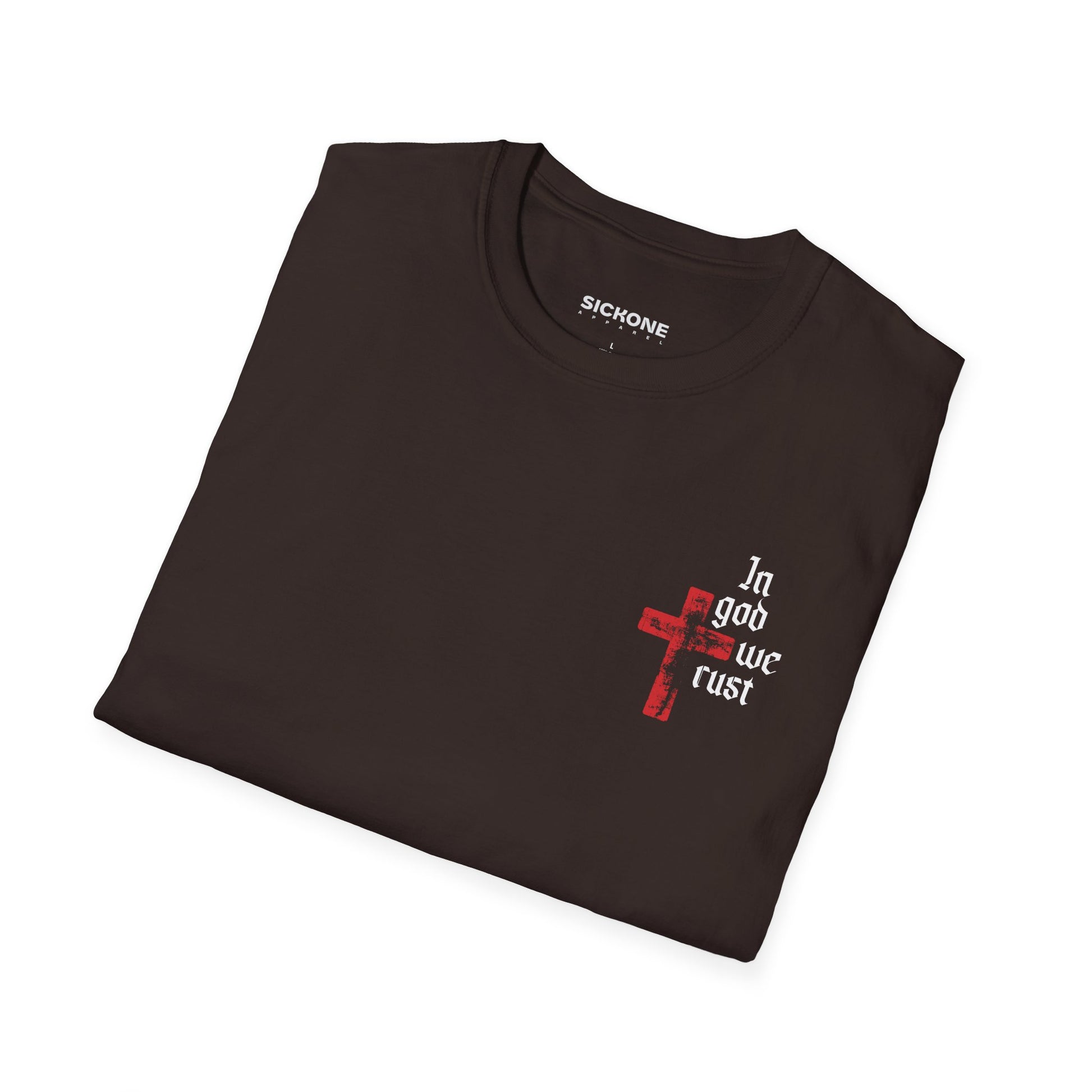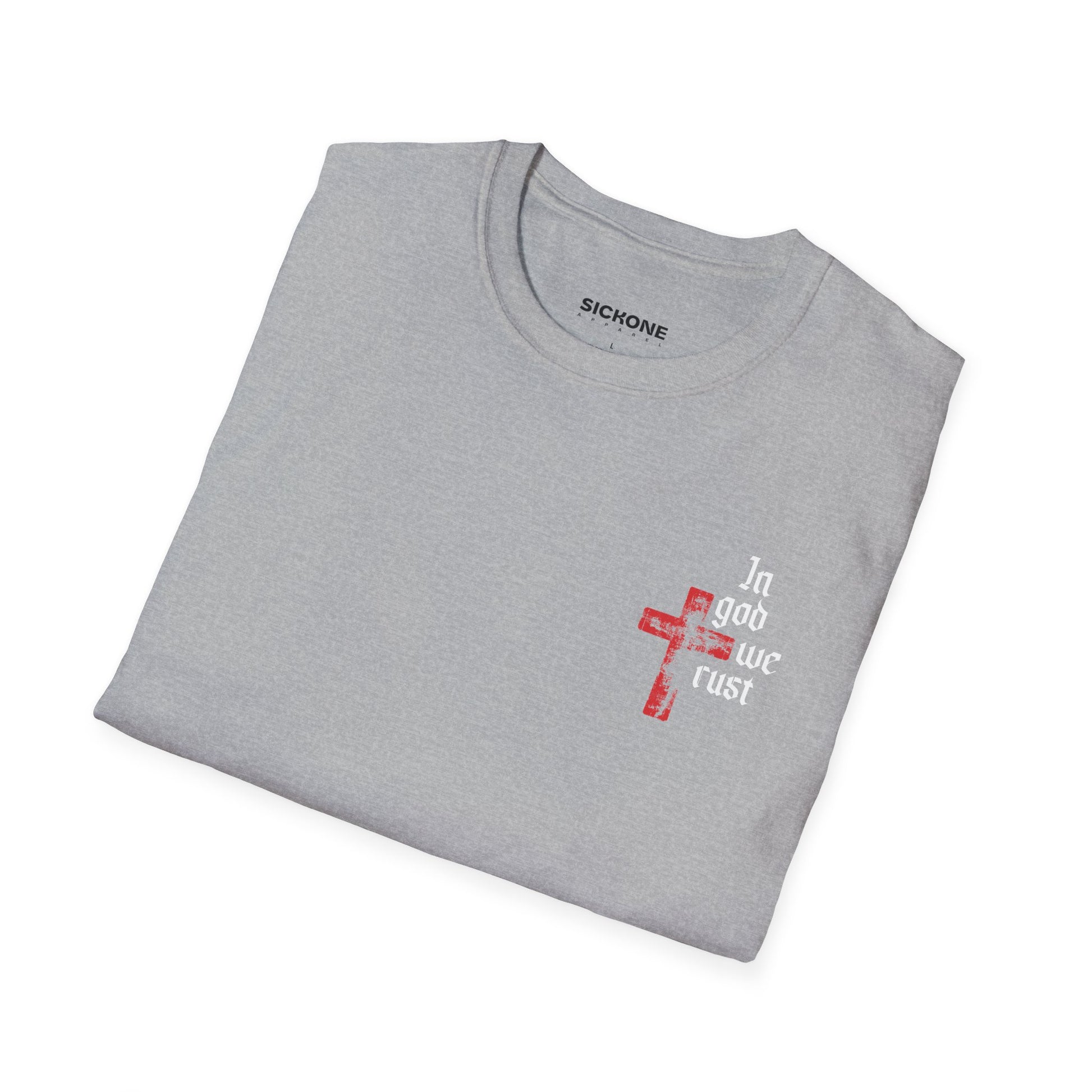 The In God We Trust – Proverbs 3:5 features a minimal distressed red cross and gothic lettering on the chest, with a powerful full-back design that reads: